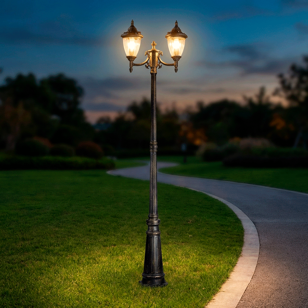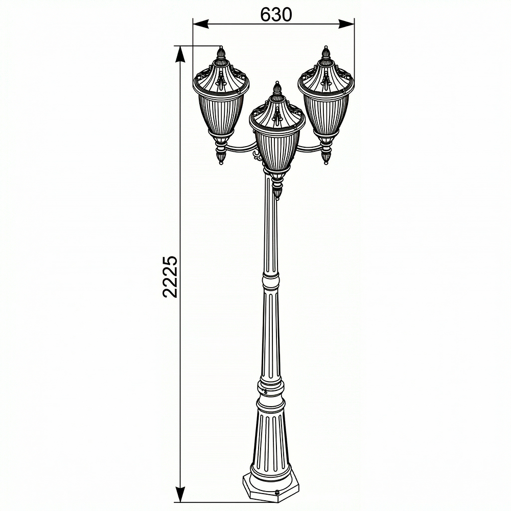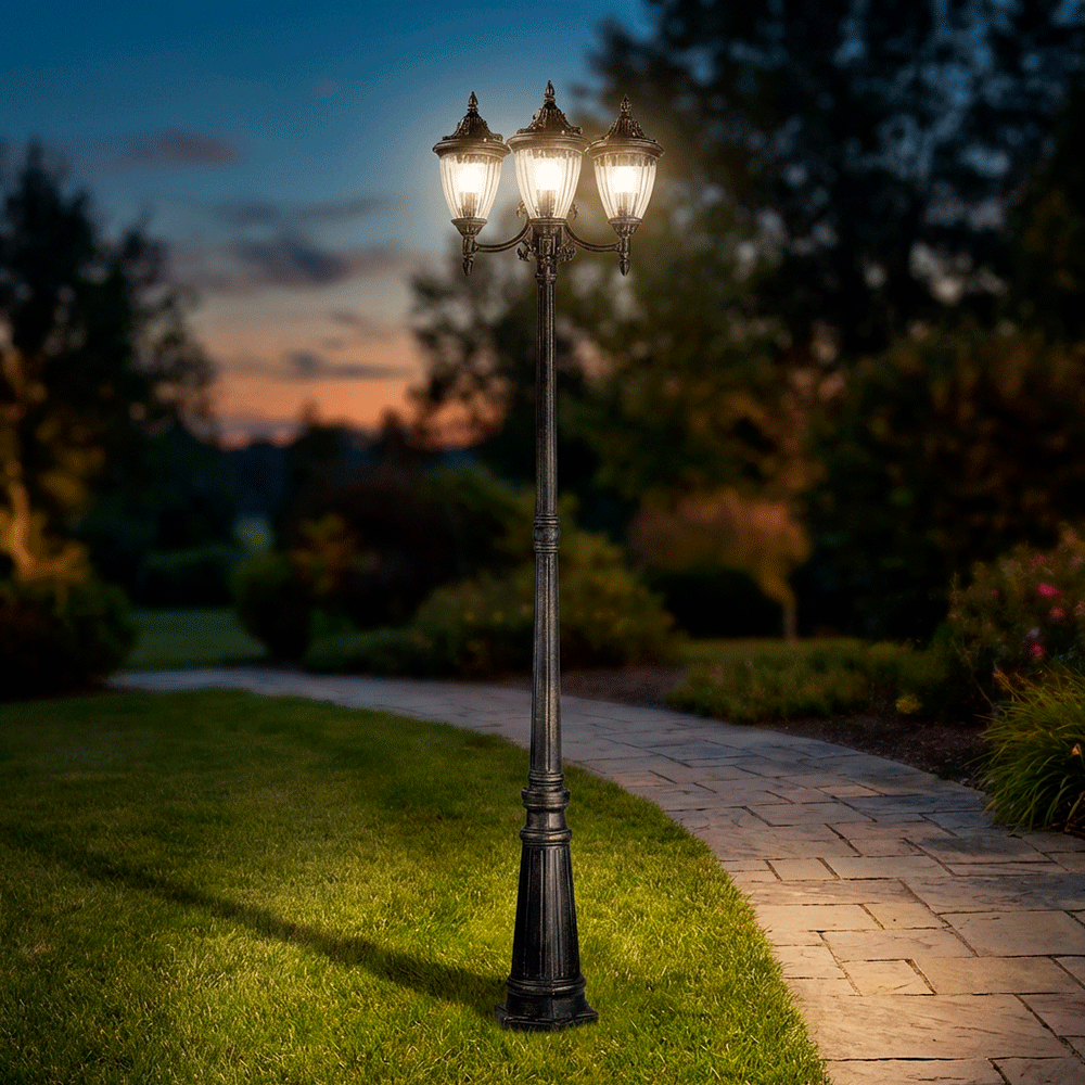 Напольный высокий светильник с тремя плафонами отлично справиться с освещением больших участков территории, а также придаст оригинальности и элегантности дизайну сада или парка. Светильник изготовлен из качественного алюминия и может использовать любые типы лам, но с цоколем Е27.