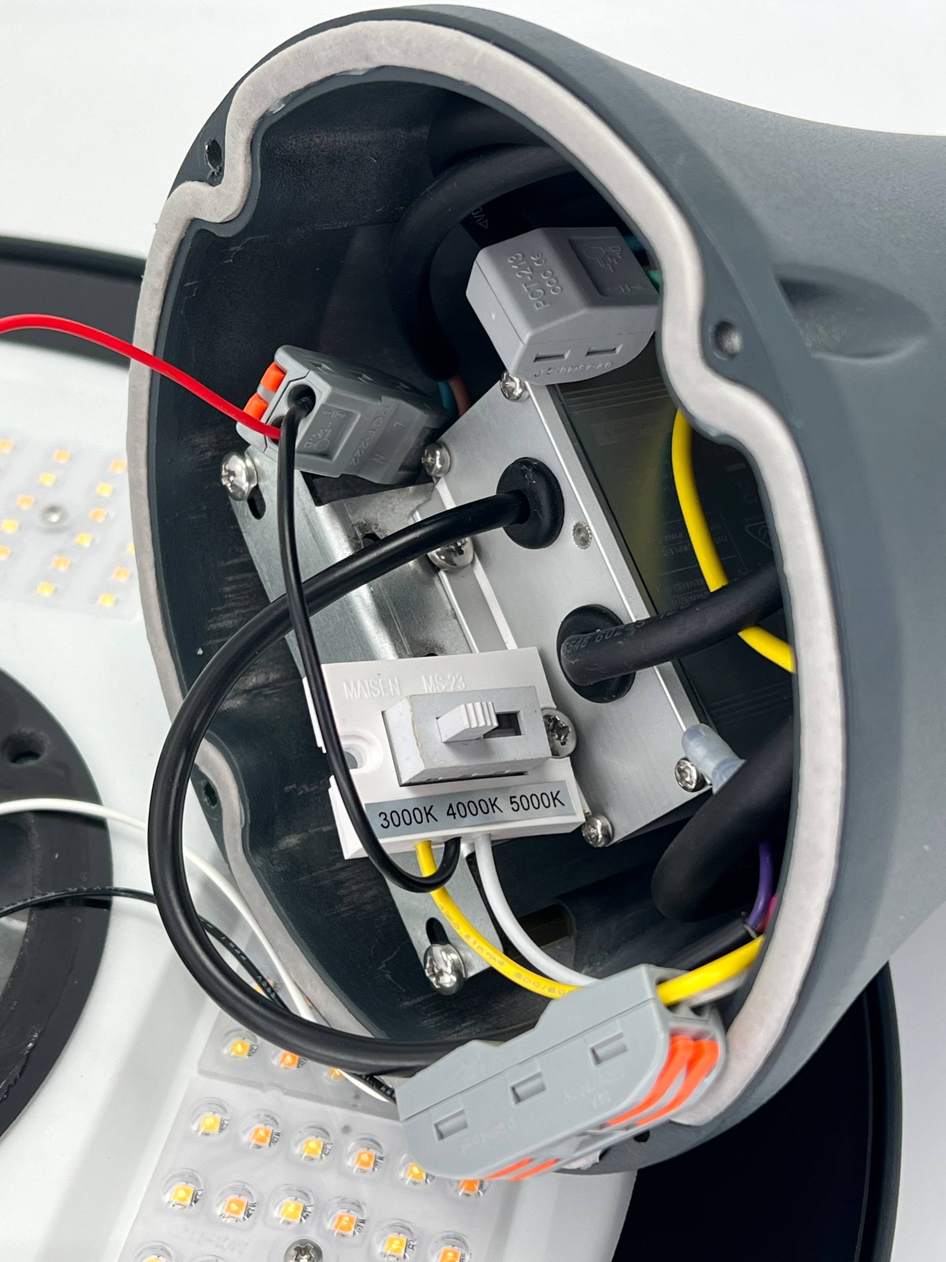 - В светильнике находится переключатель режимов свечения. Заводская установка - режим 3000K. Перед установкой каждый потребитель может выбрать предпочтительный, из 3-х вариантов (3000-4000-5000К), и установить его при первоначальном монтаже светильника или изменить в процессе эксплуатации.
